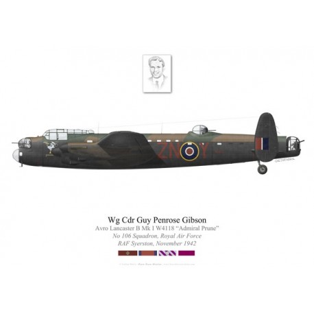 Wing Commander Guy Penrose Gibson VC DSO* DFC* (1918-1944), was the first CO of the RAF's 617 Squadron, which he led in the Dam Busters raid (Operation Chastise) in 1943, resulting in the destruction of two large dams in the Ruhr area. He was awarded the Victoria Cross, but lost his life later in the war. He had completed over 170 operations at the age of 26.