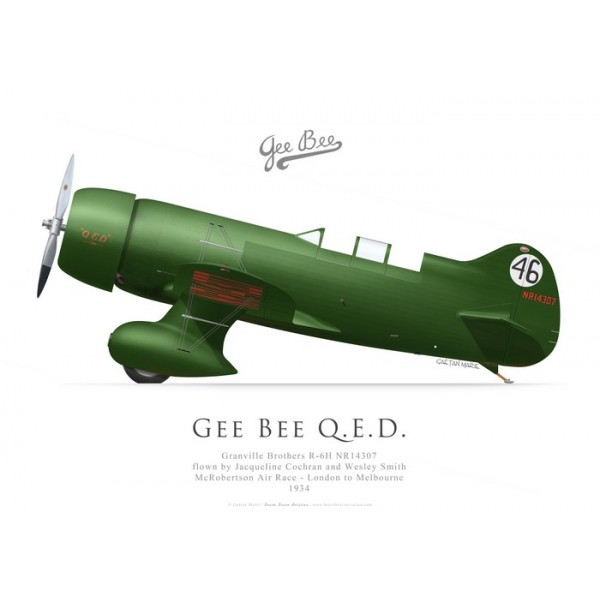 Sponsored by Lucky Strike, the Gee Bee QED was entered in the London-to-Melbourne McRobertson race by Jacqueline Cochran and Wesley Smith in 1934, but had to abandon due to mechanical problems.