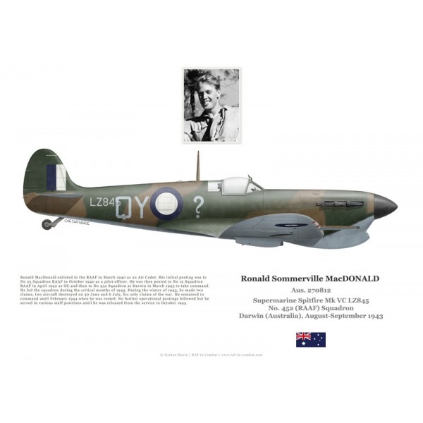High-quality aviation art print of Spitfire Mk VC LZ845 flown by Squadron Leader Ronald Sommerville MacDonald, CO of No. 452 Squadron RAAF at Darwin, August–September 1943. Detailed side-view profile of an experienced RAAF combat pilot's Spitfire.