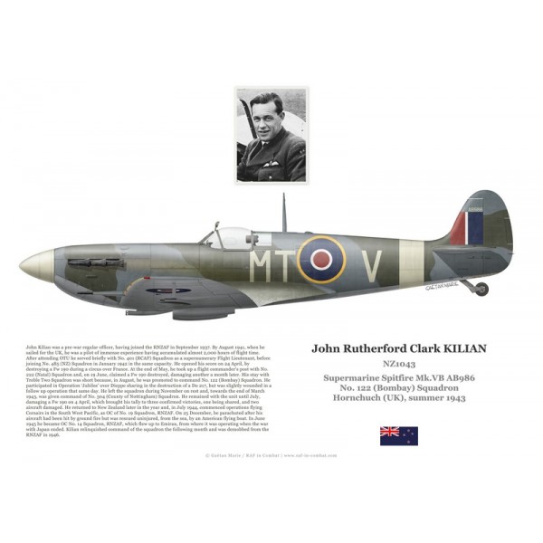 High-quality aviation art print of Spitfire Mk VB AB986 flown by Squadron Leader John R. C. Kilian, an experienced RNZAF fighter commander and CO of No. 122 (Bombay) Squadron at Hornchurch, summer 1943.