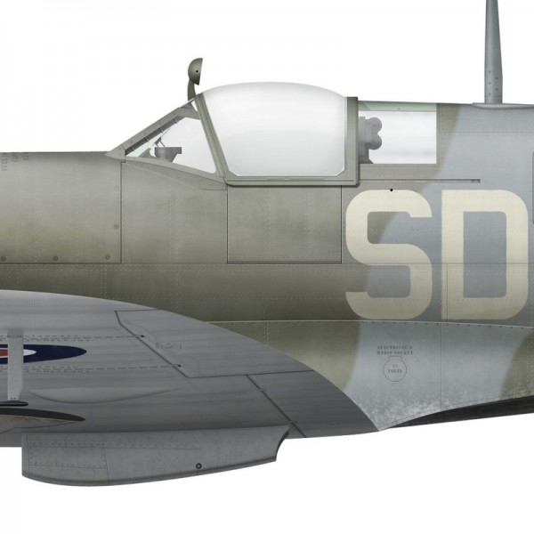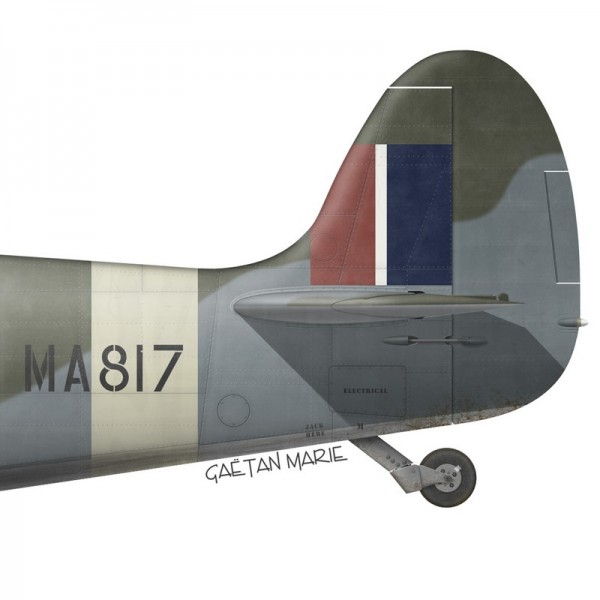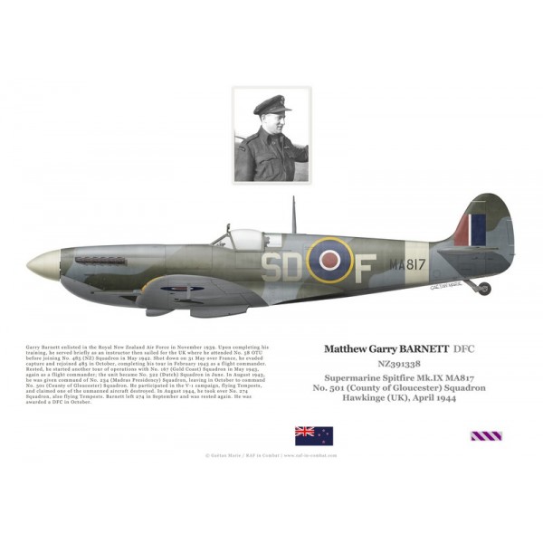 High-quality aviation art print of Spitfire Mk.IX MA817 flown by Matthew Garry Barnett of No. 501 (County of Gloucester) Squadron at Hawkinge, April 1944, decorated RNZAF pilot awarded the DFC and involved in the campaign against V-1 flying bombs.
