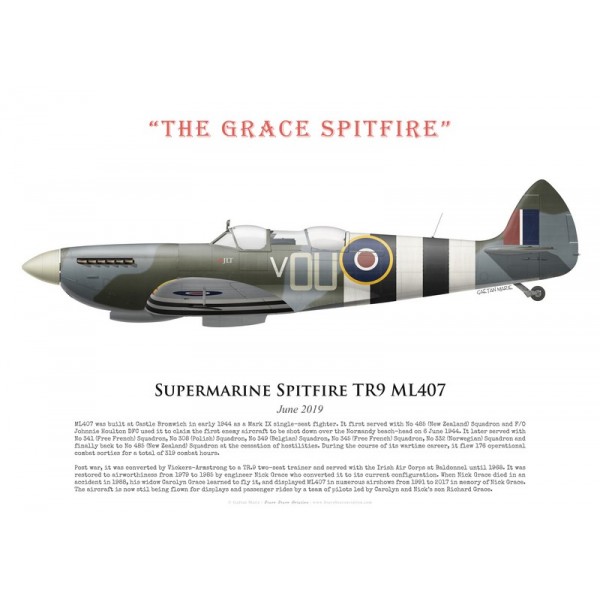 Post war, it was converted by Vickers-Armstrong to a TR.9 two-seat trainer and served with the Irish Air Corps at Baldonnel until 1968. It was restored to airworthiness from 1979 to 1985 by engineer Nick Grace who converted it to its current configuration. When Nick Grace died in an accident in 1988, his widow Carolyn Grace learned to fly it, and displayed ML407 in numerous airshows from 1991 to 2017 in memory of Nick Grace. The aircraft is now stil being flown for displays and passenger rides by a team of pilots led by Carolyn and Nick’s son Richard Grace.