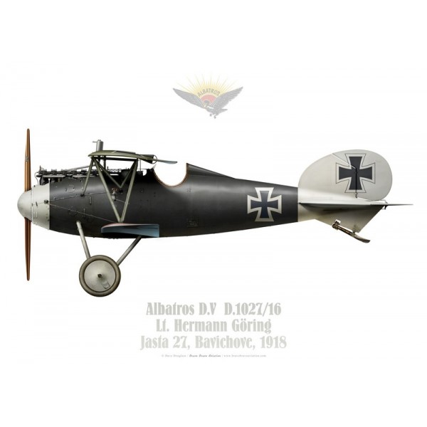 Print, poster ou lithographie aéronautique de haute qualité de l’Albatros D.V D.1027/16 du Lt Hermann Göring, Jasta 27 à Bavichove en 1918. Profil détaillé d’un chasseur emblématique de la Première Guerre mondiale.
