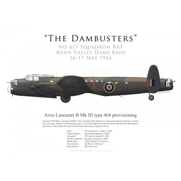 Flown by P/O Ottley, Lancaster ED910 / AJ-C was part of the third wave of the attack and was diverted to attack the Lister dam. Before it could reach its target, it was hit by light Flak north of Hamm and fell in the Boselargerschen forest. Only Frank Tees survived the crash and became a prisoner of war.