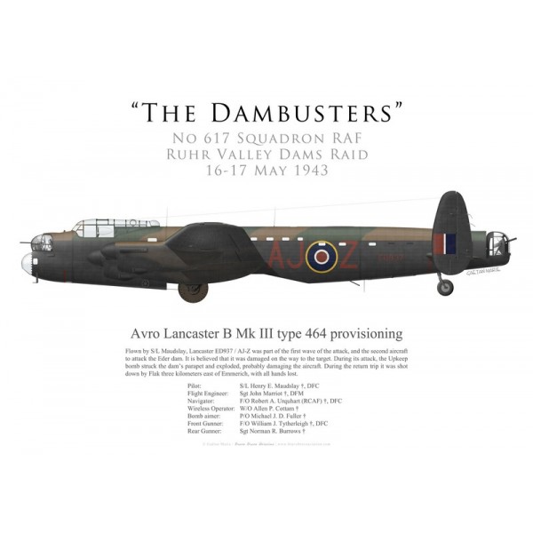 Flown by S/L Maudslay, Lancaster ED937 / AJ-Z was part of the first wave of the attack, and the second aircraft to attack the Eder dam. It is believed that it was damaged on the way to the target. During its attack, the Upkeep bomb struck the dam’s parapet and exploded, probably damaging the aircraft. During the return trip it was shot down by Flak three kilometers east of Emmerich, with all hands lost.