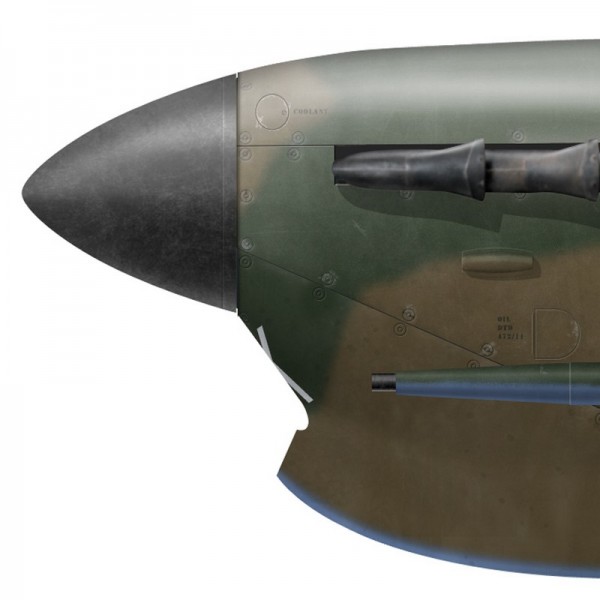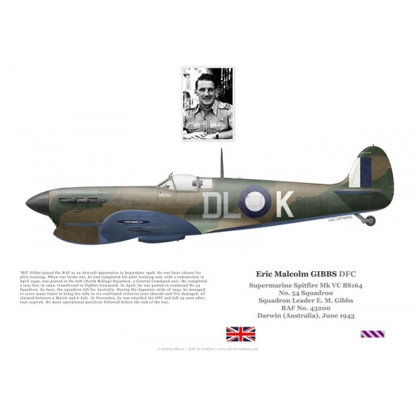 Print, poster ou lithographie aéronautique de haute qualité du Spitfire Mk VC BS164 piloté par le Sqn Ldr Eric “Bill” Gibbs du No 54 Squadron à Darwin, juin 1943. Profil en vue latérale d’un as de la RAF crédité de six victoires.