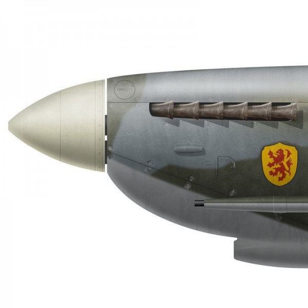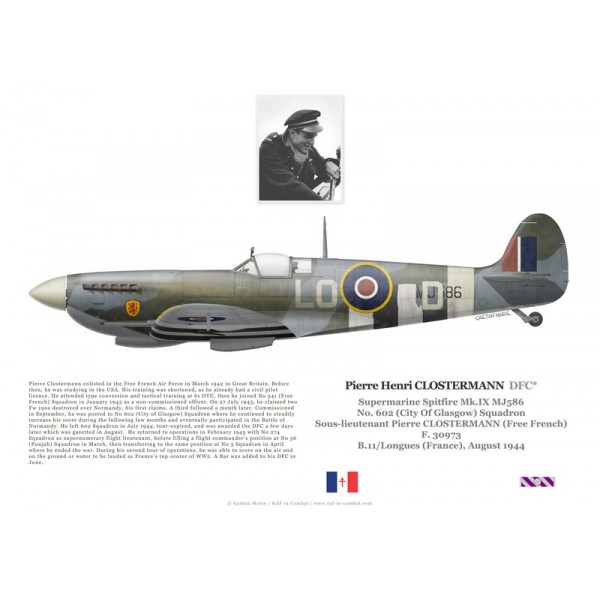 Print, poster ou lithographie aéronautique de haute qualité du Spitfire Mk.IX MJ586 piloté par Pierre Clostermann, No 602 Squadron (City of Glasgow), à Longues (France) en août 1944 et as des FAFL, et "Premier Chasseur de France".
