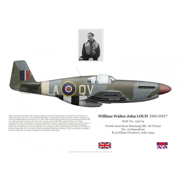 Print, poster ou lithographie aéronautique de haute qualité du Mustang Mk III FZ190 et du Flt Lt William Walter John « Bill » Loud, pilote de chasse RAF décoré de la DSO et de la DFC, au No 19 Squadron à Ellon, France, juillet 1944.