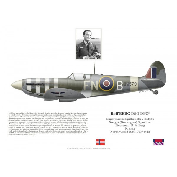 Print, poster ou lithographie aéronautique de haute qualité du Spitfire Mk V BM579 piloté par Rolf Berg, as norvégien (6 victoires), commandant du No 331 Squadron à North Weald en juillet 1942. Profil en vue latérale.