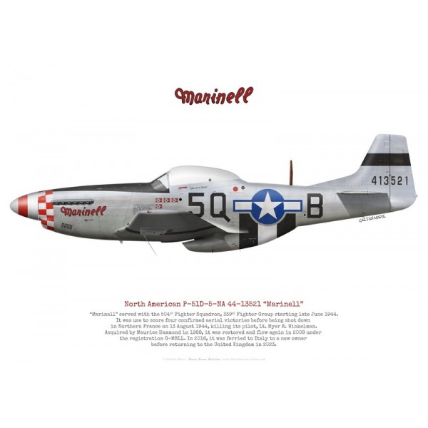 Print, poster ou lithographie aéronautique de haute qualité du warbird P-51D Mustang “Marinell”, anciennement du 504th Fighter Squadron, 339th FG, 8th Air Force. Crédité de 4 victoires avant d’être abattu en France en août 1944. Vue de profil.