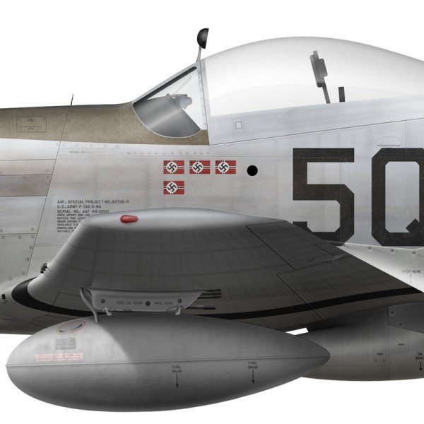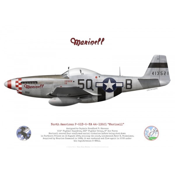 Print, poster ou lithographie aéronautique de haute qualité du P-51D Mustang “Marinell” du 504th Fighter Squadron, 339th FG, 8th Air Force. Crédité de 4 victoires avant d’être abattu en France en août 1944. Vue de profil.