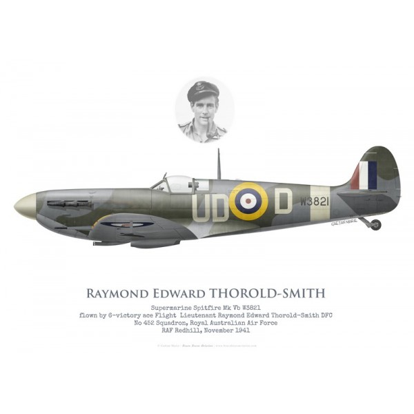 Print, poster ou lithographie aéronautique de haute qualité du Spitfire Mk Vb W3821 piloté par le Flt Lt Raymond Edward Thorold-Smith du No 452 Squadron RAAF à Redhill en novembre 1941 et as de la RAF crédité de 6 victoires confirmées.