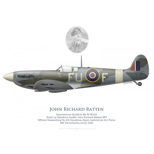 Print, poster ou lithographie aéronautique de haute qualité du Spitfire Mk Vb BL516 piloté par le Sqn Ldr John Richard Ratten, commandant le No 453 Squadron RAAF à Hornchurch début 1943, chef d’escadrille de la RAAF.